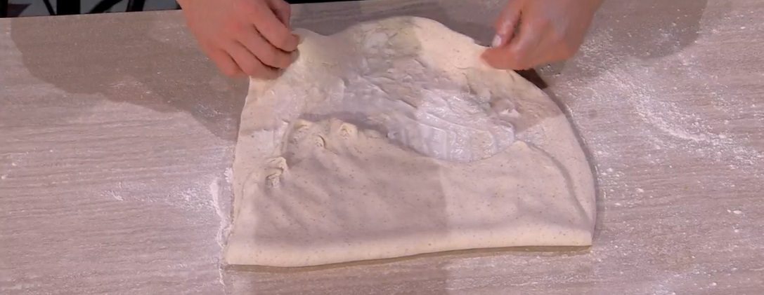 Stendiamo l’impasto con il mattarello, creando un rettangolo spesso circa mezzo cm. Spalmiamo sopra lo strutto, quindi ripieghiamo il rettangolo a portafoglio (piega a 3).