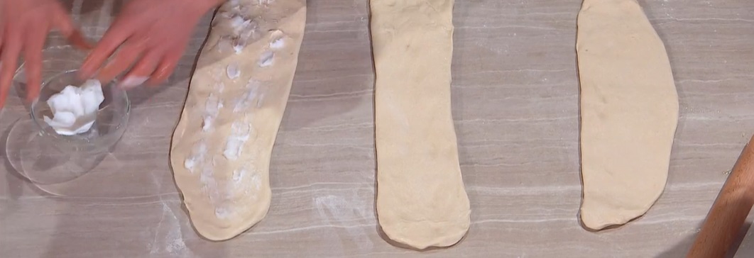 Dividiamo l’impasto lievitato in tre parti uguali. Stendiamo ciascuna con il mattarello, in modo da ottenere tre lingue sottili e lunghe, circa della stessa forma. Spalmiamo su ognuna un velo di strutto, quindi le sovrapponiamo. Le assottigliamo con il mattarello e pieghiamo a 3 o portafoglio. Copriamo e lasciamo lievitare ancora 1 ora a temperatura ambiente.