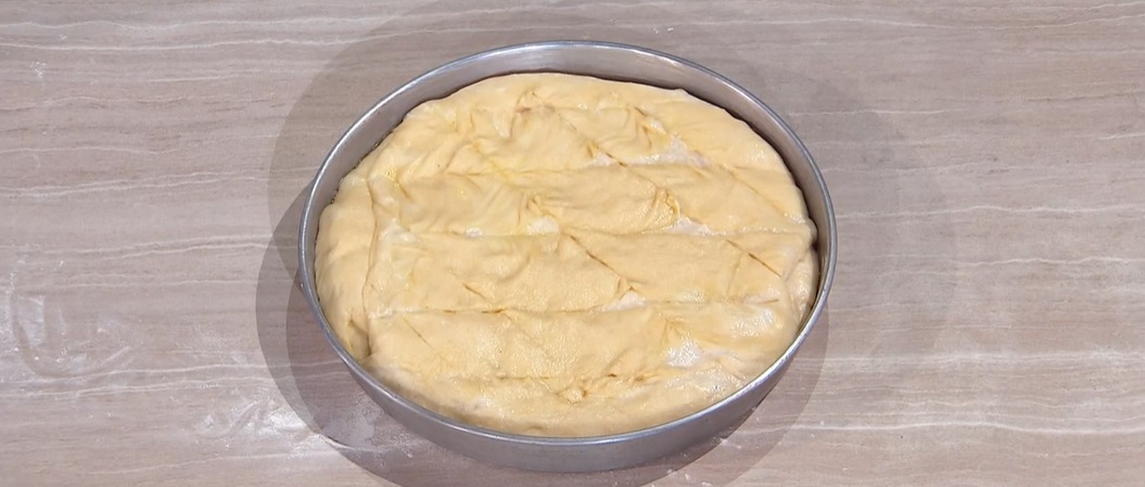 Stendiamo l’impasto con le mani e lo inseriamo all’interno di una tortiera unta di strutto. Con un coltello, indiciamo una griglia in superficie. Copriamo e lasciamo riposare ancora mezz’ora.