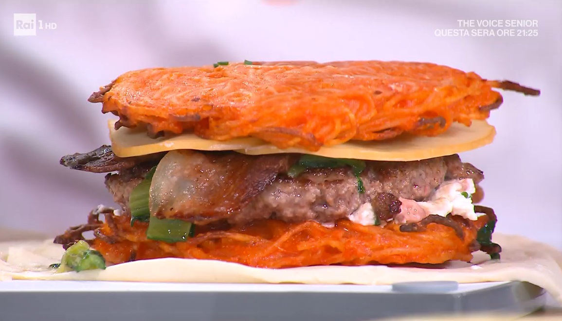 Stendiamo un disco di sfoglia e ritagliamo dei dischi più larghi dei burger e dei dischi di spaghetti. Adagiamo sopra un disco di spaghetti, quindi spalmiamo sopra un po’ di ricotta, adagiamo sopra il burger, un po’ di cicoria, la pancetta croccante, la provola affumicata a fette e finiamo con un altro disco di spaghetti. Copriamo con un altro disco di sfoglia e sigilliamo i bordi. Cuociamo in forno caldo e statico a 180° per 20 minuti.
