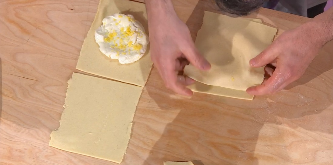 Per il ripieno, compriamo un formaggio pecorino senza sale, di pochi giorni. Lo lasciamo sgocciolare 2 giorni in frigorifero, poi 2 giorni fuori dal frigorifero (diventa leggermente acido). Trascorsi questi giorni, lo tagliamo a pezzetti e lo scaldiamo leggermente in padella, in modo da farlo ammorbidire e filare (non deve bollire). Una volta morbido, spegniamo e ne prendiamo un pugnetto con le mani bagnate, lo strizziamo e lo pressiamo all’intero di un coppapasta, in modo da formare una sorta di burger. Grattugiamo sopra la scorza grattugiata del limone.