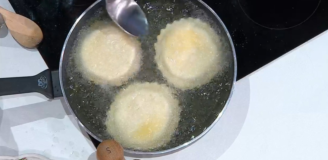 Stendiamo l’impasto con la sfogliatrice, fino ad ottenere una sfoglia sottile (2 mm). Posizioniamo sopra i tondini di formaggio e richiudiamo la sfoglia sul ripieno. Premiamo facendo uscire tutta l’aria, quindi ritagliamo la seadas con una rotella dentellata. Immergiamo le seadas in olio caldo e profondo a 170° e lasciamo friggere fino a doratura, ‘nappando’ la parte superiore delle seadas con l’olio bollente e rigirandole a metà cottura.
