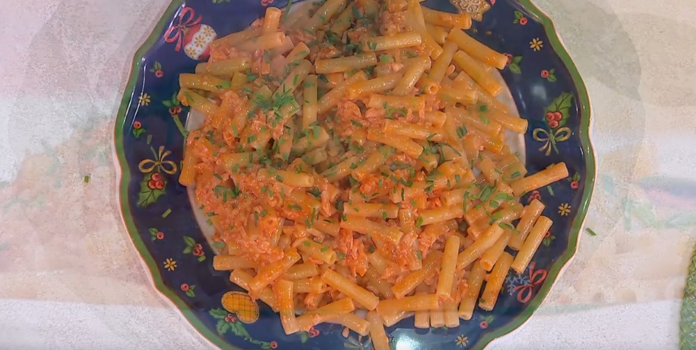 Un trionfo emiliano romagnolo, oggi, nel mezzogiorno di Rai1. Oltre al prof Persegani ed alla sfoglina Spisni, arriva in cucina anche la romagnola zia Cri. La cuoca ci prepara un primo piatto veloce, i sedanini al salmone.