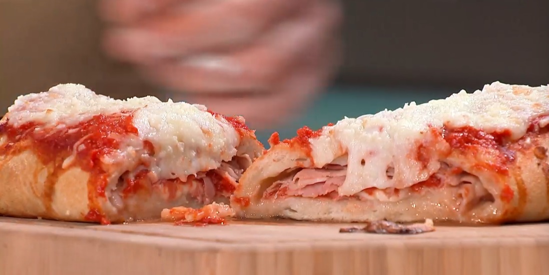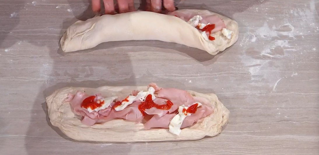 Con le mani, schiacciamo ciascun panetto, allungandolo: otterremo due lingue. Disponiamo sopra il prosciutto cotto, la mozzarella ben scolata e a listarelle e qualche goccia di passata di pomodoro e origano. Richiudiamo l’impasto sul ripieno, a formare due filoni, che disponiamo su una teglia, copriamo e lasciamo lievitare 45 minuti.