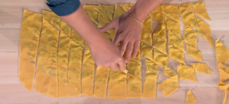 Tiriamo la sfoglia sottile, in modo da ottenere un grosso quadrato. Sulla metà, spalmiamo il ripieno preparato. Ripieghiamo l’altra metà della sfoglia sul ripieno e pressiamo leggermente con un canovaccio, in modo da farla aderire. Con una rotella dentellata, ritagliamo dei quadratini. Cuociamo in acqua bollente e salata: quando l’acqua riprende il bollore, li scoliamo direttamente nel piatto da portata.