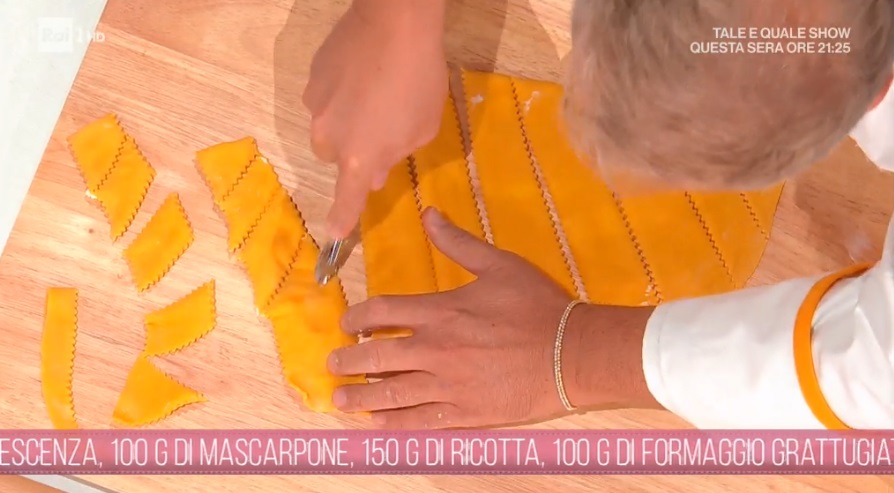 Per il ripieno, in una ciotola, mescoliamo la ricotta con la crescenza, il mascarpone ed il formaggio grattugiato. Ottenuta una crema omogenea e liscia, la spalmiamo su metà sfoglia, quindi ripieghiamo l’altra metà della sfoglia sul ripieno. Pressiamo, in modo da far uscire l’aria. Tagliamo la sfoglia a losanghe con una rotella. La cuociamo in acqua bollente e salata per un paio di minuti.