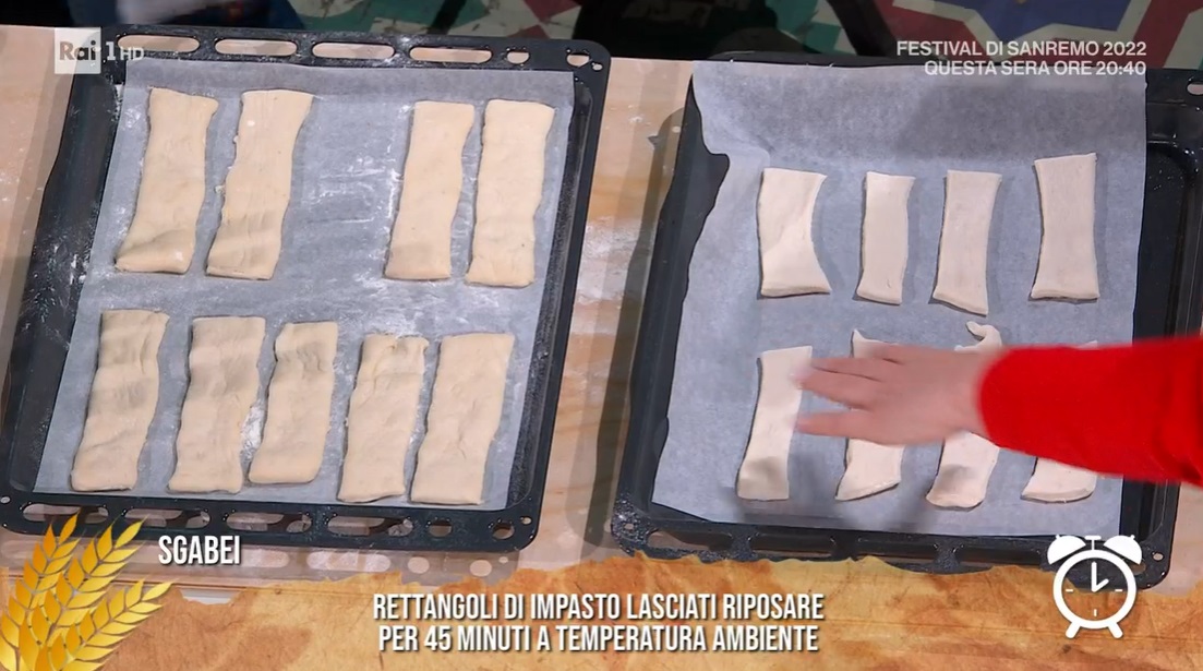 Stendiamo l’impasto con il mattarello, ad uno spessore di circa mezzo cm. Ritagliamo dei rettangoli e li disponiamo su una teglia. Copriamo con la pellicola e lasciamo riposare ancora 45 minuti a temperatura ambiente.