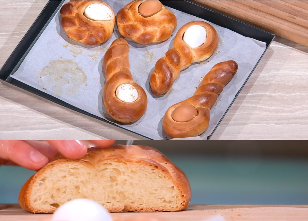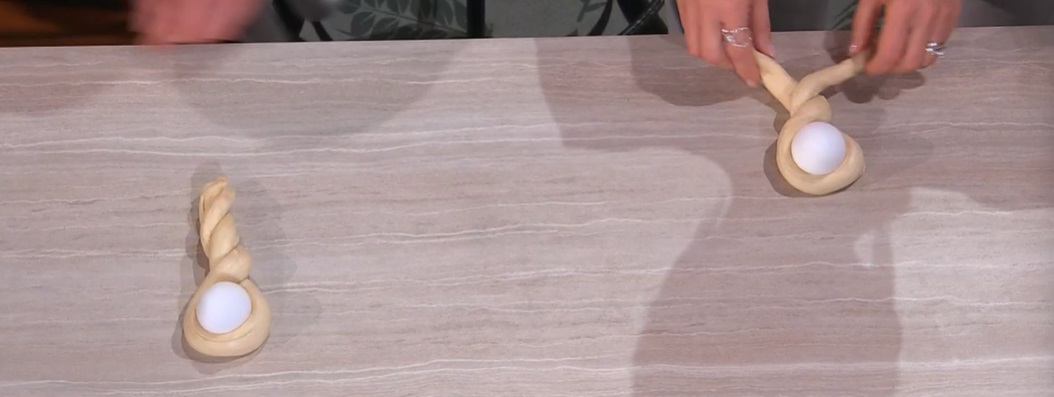 Allunghiamo ogni panetto, formando dei filoncini lunghi e sottili (circa 1-2 cm). Posizioniamo un uovo sul tavolo ed avvolgiamo intorno il filoncino di impasto (come foto). Disponiamo sulle teglie, copriamo e lasciamo lievitare per 2 ore a temperatura ambiente. Spennelliamo con l’uovo sbattuto e cuociamo in forno caldo e statico a 200° per 15 minuti.