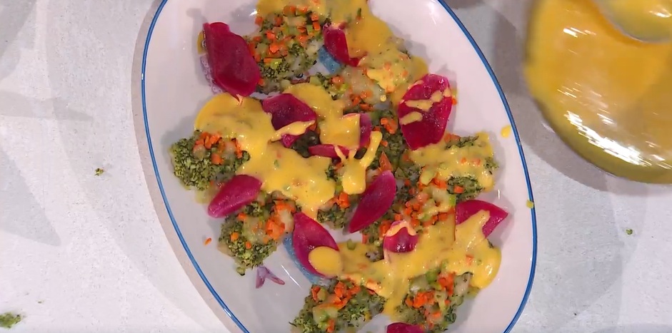 Salsa: in una ciotola, mettiamo i tuorli, il succo di limone e l’acqua. Montiamo con una frusta manuale, ponendo la ciotola sul bagnomaria. Quando si addensa e schiarisce, togliamo dal bagnomaria ed aggiungiamo il burro fuso (a 40°) a filo, continuando a montare con la frusta.
