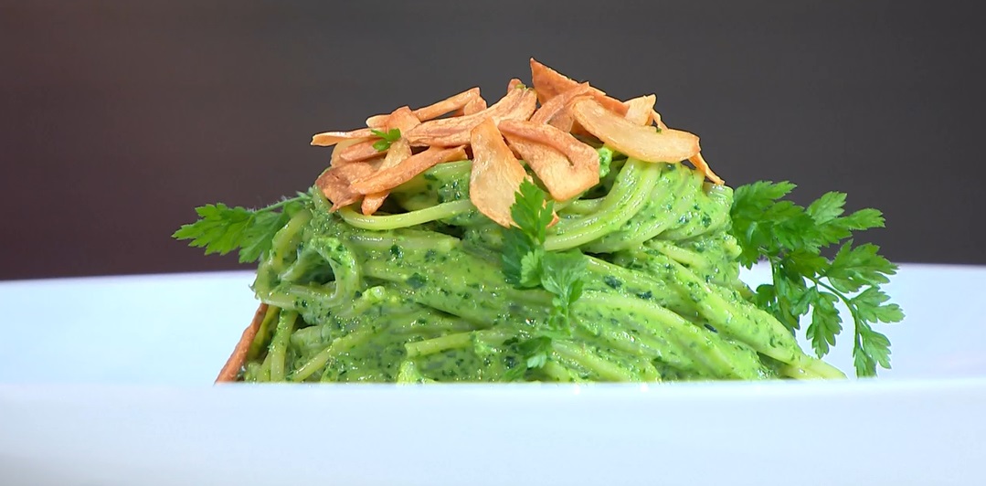 Scoliamo la pasta al dente e la saltiamo in padella con la colatura di alici, il parmigiano grattugiato e la crema al prezzemolo. Serviamo con sopra le lamelle di aglio fritto.