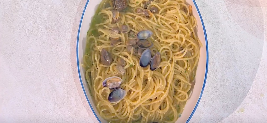 In padella, quindi, mettiamo le vongole sgusciate, la loro acqua filtrata e l’amido di mais sciolto in poca acqua fredda. Accendiamo il fuoco, uniamo gli spaghetti al dente e saltiamo per qualche istante, aggiungendo anche del prezzemolo tritato.