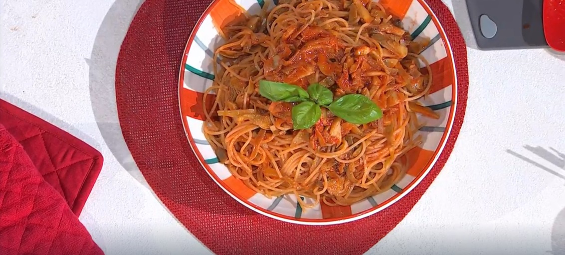 - 500 g spaghetti, 6 carciofi, 400 g pomodori pelati, 1 spicchio d’aglio, basilico, olio evo, sale e pepe
