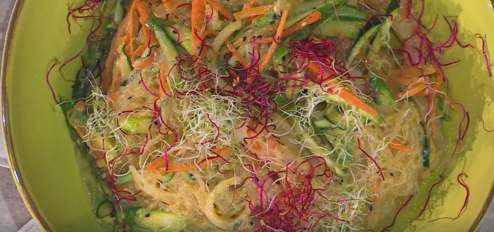 - 250 g spaghetti di riso, 200 g gamberi, 1 zucchina, 1 carota, 8 asparagi, 1 cipollotto, 1 cipolla, 13 uova, 50 ml salsa di soia, scorza di 1 lime, semi di sesamo, olio di semi