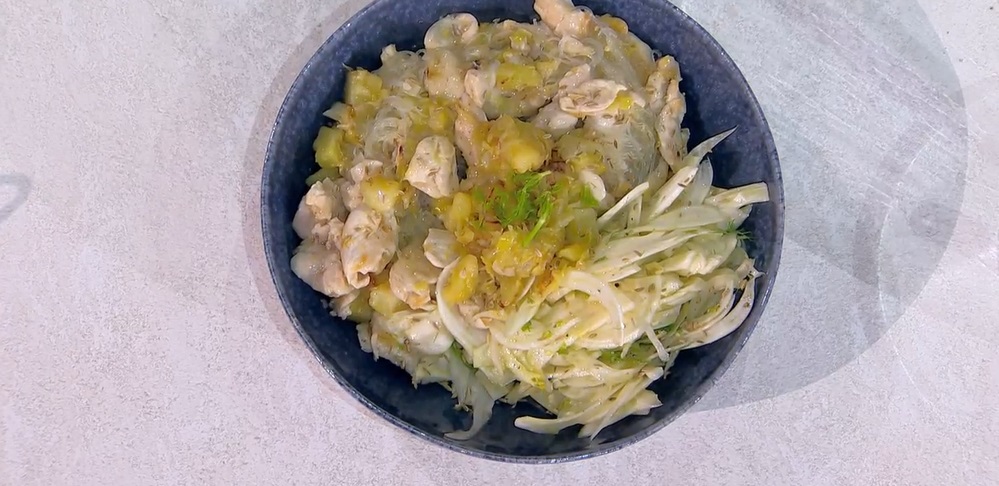 Per accompagnare, affettiamo i finocchi sottilmente, meglio se con la mandolina, li mettiamo in una ciotola e li condiamo con olio, sale, pepe macinato, scorza grattugiata d’arancia e mescoliamo.