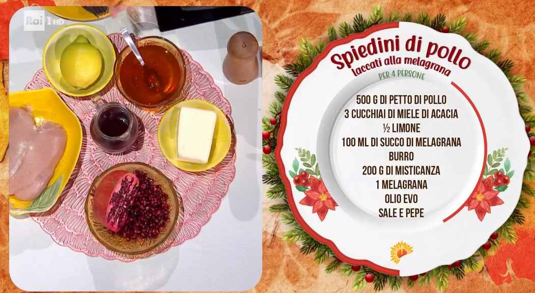 - 500 g petto di pollo, 3 cucchiai di miele di acacia, mezzo limone, 100 ml succo di melagrana, burro, 200 g misticanza, 1 melagrana, olio, sale e pepe