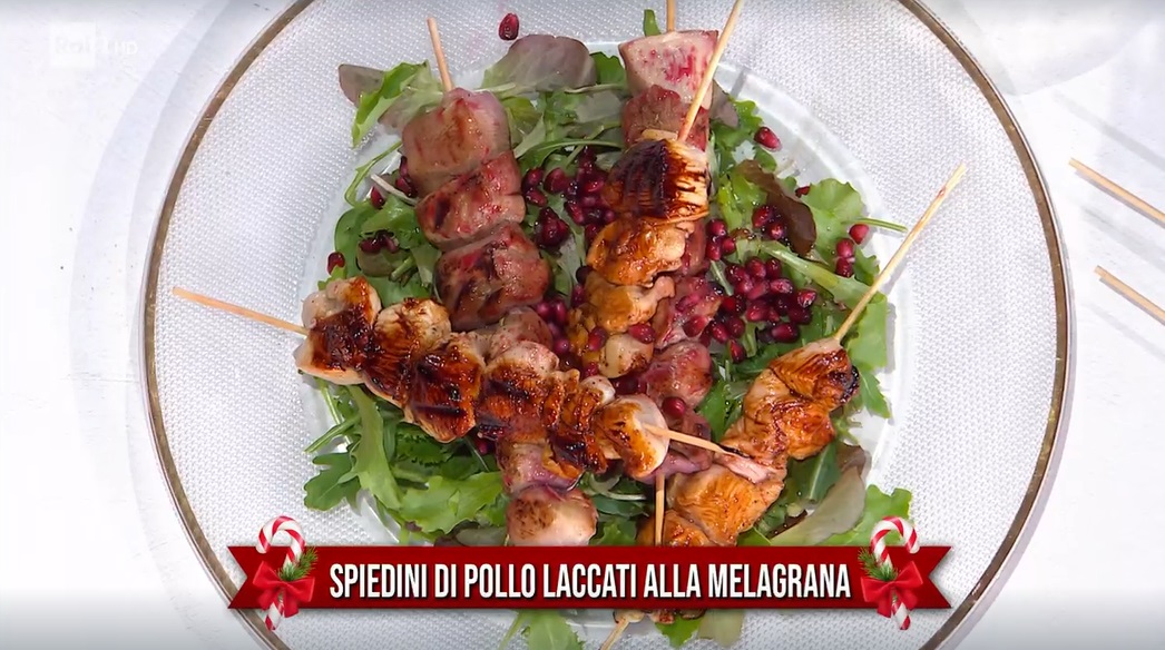 Tagliamo a bocconcini il petto di pollo, mariniamo con succo di melagrana, succo di limone, miele, sale, pepe e olio per almeno un’oretta. Togliamo i bocconcini dalla marinatura, li infilziamo nei bastoncini da spiedini.