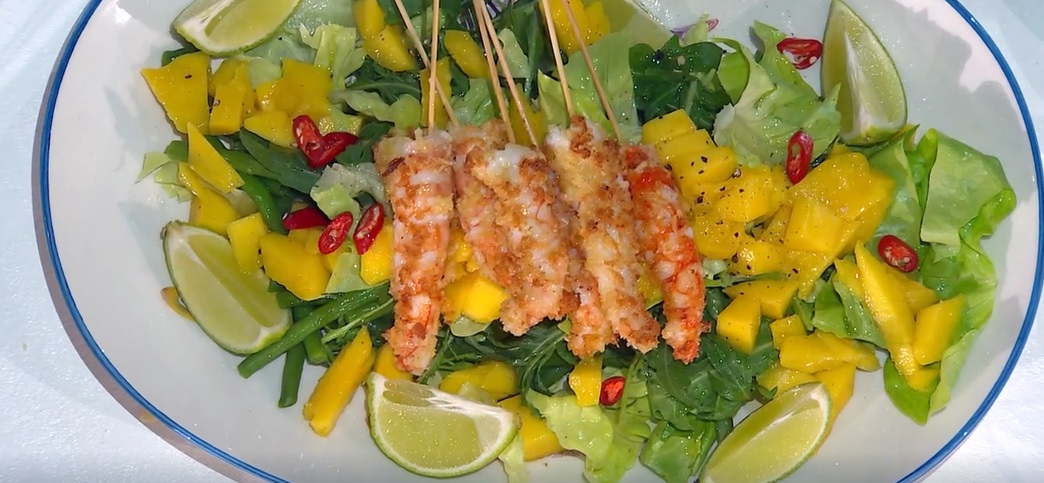 - 10 code di gambero, 1 mazzo di rucola, 1 cespo di lattuga, 400 g fagiolini, 100 g scalogno, 1 mango, 400 g panko, 3 lime, peperoncino, olio, sale e pepe