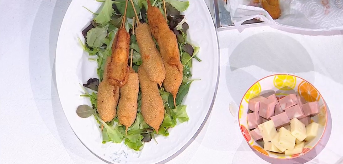 In uno spiedo, inseriamo un dadino di lonza, uno di mortadella, uno di asiago (possiamo ripetere gli strati). Passiamo gli spiedini nella besciamella, quindi nella farina, nelle uova sbattute e infine nel pangrattato. Disponiamo gli spiedini su una teglia e li mettiamo a riposare in freezer per almeno un’ora. Passiamo nuovamente gli spiedini nell’uovo e nel pangrattato. Friggiamo in olio caldo e profondo fino a doratura.