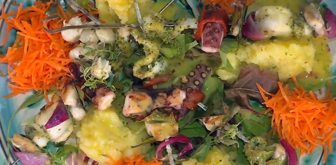Tagliamo i tentacoli di polpo già lesso a pezzettoni. Puliamo il calamaro e lo tagliamo a striscioline.
