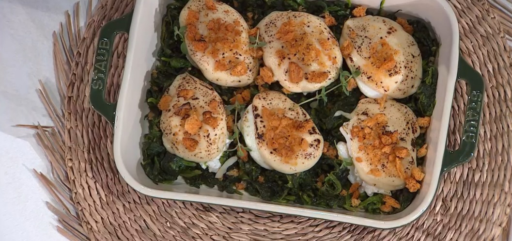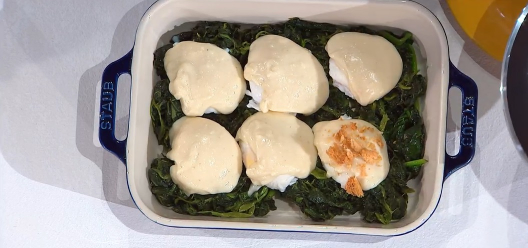 Disponiamo gli spinaci alla base di una pirofila e posizioniamo sopra le uova pochette, senza pellicola, le copriamo con la salsa e spolveriamo con il pane tostato. Mettiamo in forno caldo a 180° per 15 minuti.