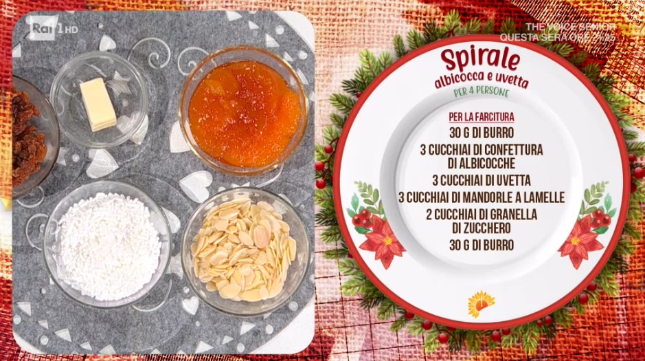 - Farcitura: 30 g burro, 3 cucchiai di confettura di albicocche, 3 cucchiai di uvetta, 3 cucchiai mandorle a lamelle, 2 cucchiai granella di zucchero, 30 g burro