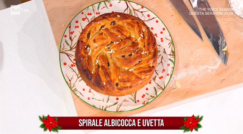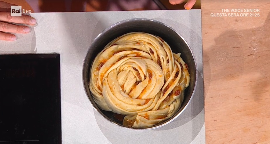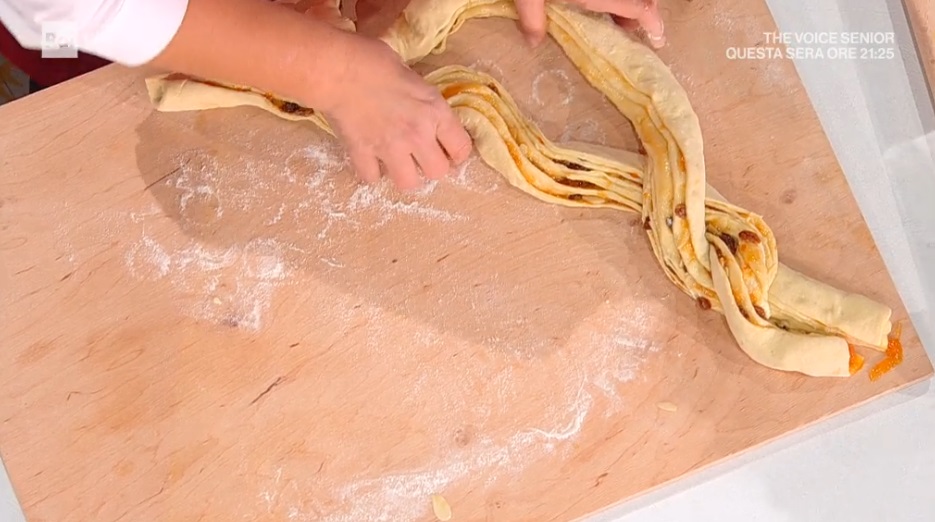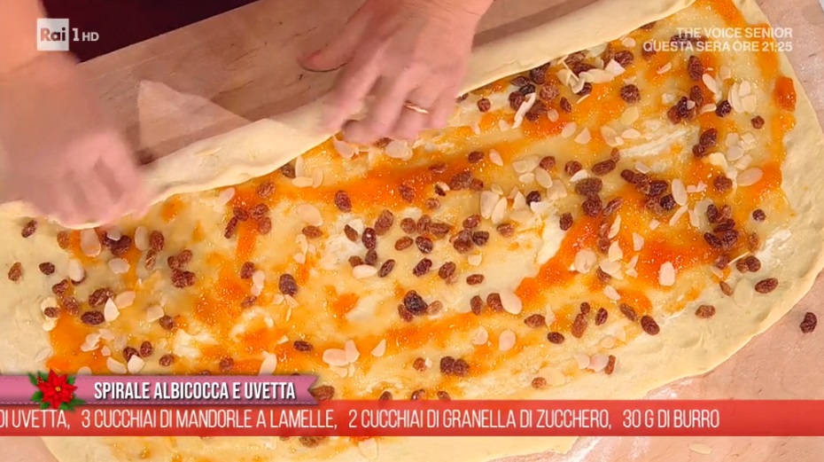 Trasferiamo l’impasto lievitato sul piano infarinato e lo allarghiamo dapprima con le mani, poi col mattarello, in modo da ottenere un rettangolo spesso mezzo cm. Massaggiamo la superficie con il burro a pomata. Spalmiamo sopra la confettura di albicocche e distribuiamo sopra l’uvetta e le mandorle, a lamelle o tritate. Arrotoliamo l’impasto sul ripieno, partendo dal lato lungo. Otterremo un lungo salsicciotto, che tagliamo a metà. Intrecciamo tra loro le due metà, quindi arrotoliamo su se stessa la treccia, in modo da formare una spirale.