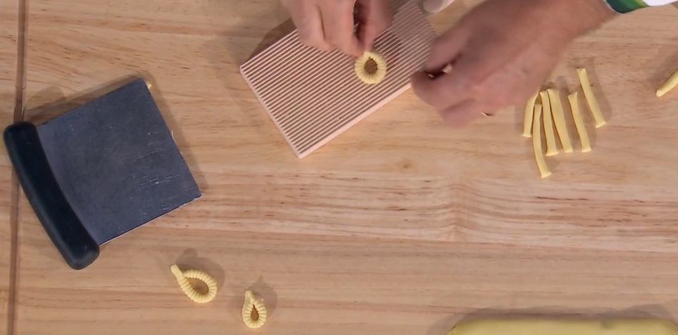 Con l’impasto, formiamo dei serpentelli sottili, che tagliamo ad una lunghezza di circa 8 cm. Li premiamo, con un tarocco, su un riga gnocchi, formando dei maccheroncini cavi. Chiudiamo a ciambella, pizzicando la giuntura e dando una forma a goccia. Cuociamo in acqua bollente e salata per il tempo necessario.