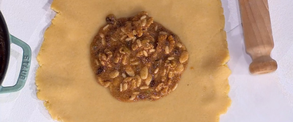 Stendiamo la frolla ad uno spessore di 3-4 mm e ritagliamo un disco di circa 25 cm di diametro. Distribuiamo al centro il ripieno e lo livelliamo. Copriamo con un altro disco di frolla e sigilliamo intorno al ripieno, pressando. Eliminiamo l’eccesso di frolla e bucherelliamo la superficie. Cuociamo in forno caldo e statico a 180° per 30 minuti. Si conserva per giorni e giorni, in credenza.