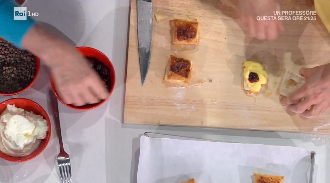 Su un quadrato di sfoglia bucherellato, spalmiamo un po’ di crema (diplomatica o pasticcera), gocce di cioccolato o amarene sciroppate, e chiudiamo un quadrato di sfoglia spennellato con l’uovo.