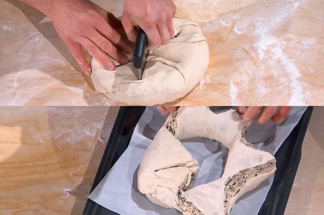 Con il matterello, stendiamo l’impasto SENZA semi, in modo da ottenere un disco sottile. Posizioniamo al centro la pagnotta con i semi e richiudiamo la sfoglia bianca sulla pagnotta, come fosse una copertina. Rivolgiamo le pieghe verso l’alto e schiacciamo leggermente la pagnotta. Pratichiamo tre tagli al centro, a disegnare una stella (foto).