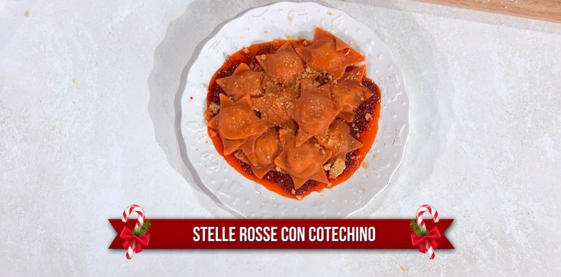 Tiriamo la sfoglia sottile (la otteniamo impastando la farina con le uova ed il concentrato di pomodoro) e distribuiamo sopra delle noci di ripieno. Ripieghiamo la sfoglia sul ripieno, facendo ben aderire. Tagliamo le stelle con l’apposito attrezzo. Cuociamo in acqua bollente per un paio di minuti.