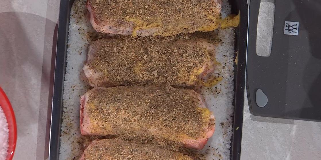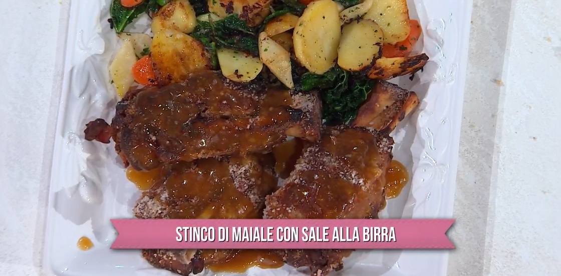 All’interno di una teglia, creiamo un letto di sale grosso. Posizioniamo sul sale gli stinchi marinati e li spennelliamo con una miscela di senape e miele. Spolveriamo con le briciole di schuttelbrot (pane di segale) miscelate al pepe, salvia e rosmarino. Copriamo il tutto con abbondante sale grosso. Spruzziamo con dell’acqua, in modo da compattare il sale, e mettiamo in forno caldo a 200° per 3 ore e mezza. A fine cottura, rompiamo la crosta di sale e preleviamo la carne. La serviamo con sopra la salsa alla birra.