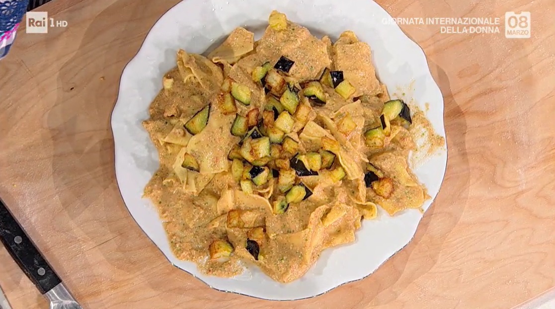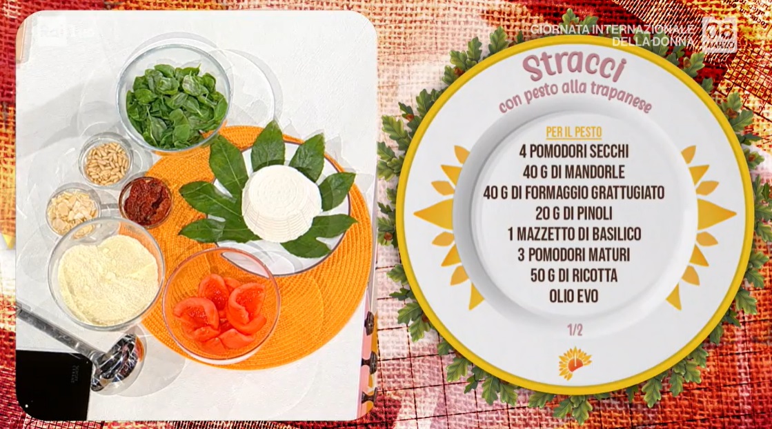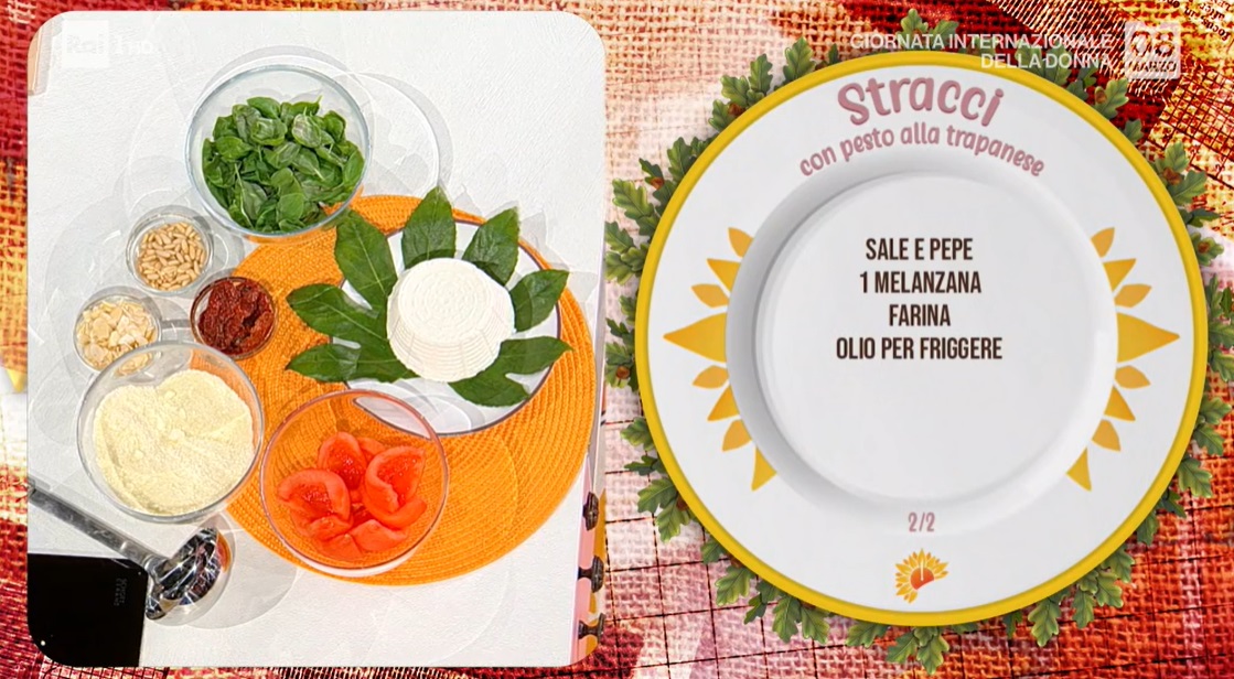 C’è sempre e non poteva mancare quest’oggi, per celebrare la donna in questa giornata particolare. Zia Cri, con la sua vivida mimosa all’occhiello, prepara un piatto che le ricorda una notte scatenata in compagnia di amiche. Prepariamo gli stracci con pesto alla trapanese.