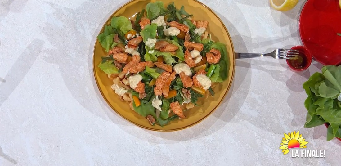 Sul piatto da portata, posizioniamo lo strauben e distribuiamo sopra l’insalata, la rucola, le verdure già cotte a pezzetti, i pomodorini, le noci, il pollo rosolato e, sopra, la salsa.