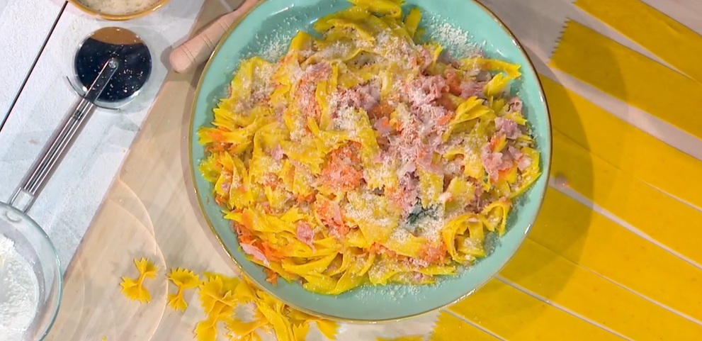 strichetti con prosciutto e carote di Alessandra SpisniIn questo primo giorno di primavera, Alessandra Spisni porta il sole nel bosco di Antonella. La maestra delle sfogline emiliane prepara un piatto a base di pasta fresca, ovvero gli strichetti con prosciutto e carote.