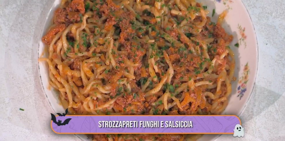Anche Zia Cri corre nello studio del mezzogiorno per festeggiare Halloween. La cuoca romagnola, introdotta dall’inconfondibile ‘lisciooo’, propone un primo piatto veloce veloce, ovvero gli strozzapreti funghi e salsiccia.