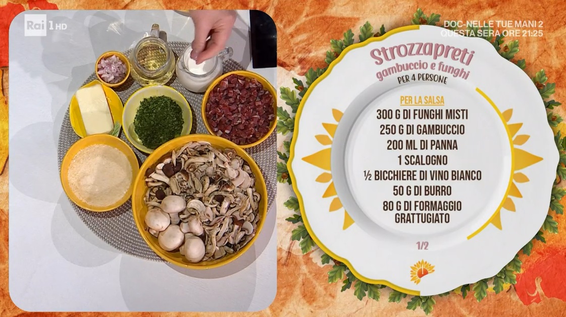 - 300 g funghi misti, 250 g gambuccio di prosciutto, 200 ml panna, 1 scalogno, mezzo bicchiere di vino bianco, 50 g burro, 80 g formaggio grattugiato, prezzemolo, sale e pepe, olio evo