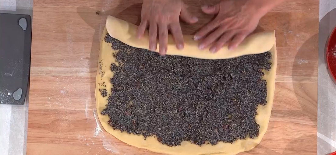 Stendiamo l’impasto lievitato con il mattarello, in modo da ottenere un rettangolo. Spalmiamo sopra il ripieno di semi ed arrotoliamo l’impasto sul ripieno. Lasciamo riposare 20 minuti. Facciamo dei tagli in superficie e inforniamo a 170° per 35/40 minuti. Spolveriamo di zucchero a velo.