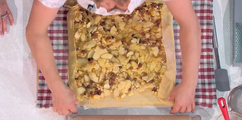 Ripieno: peliamo le mele (meglio se golden e vecchie), le affettiamo con la mandolina o le tagliamo a fettine sottili. Le raccogliamo in una ciotola e le condiamo con l’uvetta ammollata nel rum o nel succo di limone, lo zucchero, la cannella ed i pinoli tostati. Mescoliamo il tutto con le mani, rompendo un po’ le fettine di mele.