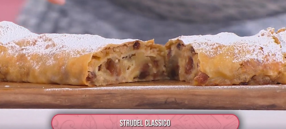 Aiutandoci con il canovaccio, arrotoliamo la sfoglia sul ripieno, dopo aver ripiegato i lati verso l’interno, formando lo strudel (foto). Spennelliamo la superficie con altro burro fuso e cuociamo in forno caldo a 180° per 30 minuti, quindi abbassiamo a 170° e lasciamo cuocere altri 30 minuti.