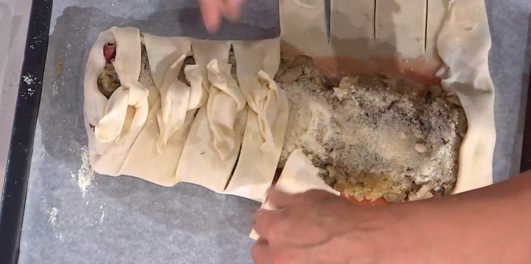 Stendiamo la pasta con il mattarello, ad uno spessore di 3-4 mm, dando la forma di un rettangolo. Posizioniamo il rettangolo su un foglio di carta forno e su una placca da forno. Incidiamo i lati, creando delle strisce. Spolveriamo al centro con del pangrattato e disponiamo sopra lo speck affettato, sopra i funghi e le patate, del parmigiano grattugiato, quindi ripieghiamo le strisce ai lati sul ripieno, intrecciandole. Spennelliamo con uovo sbattuto con latte e spolveriamo con rosmarino tritato e sale grosso. Cuociamo in forno caldo e statico a 180°per 30 minuti.