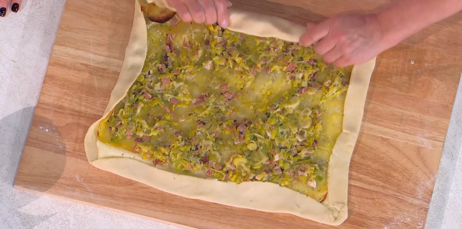 Per il ripieno, mettiamo a stufare i porri affettati in padella con un filo d’olio e lo speck a dadini. Copriamo e lasciamo cuocere il tutto per circa 20 minuti. Lasciamo raffreddare.
