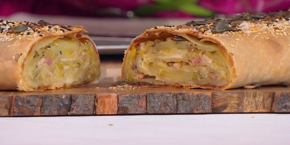 Tiriamo la sfoglia con il mattarello: dev’essere sottilissima, quasi trasparente, ed avere la forma di un rettangolo. Disponiamo sopra il formaggio tilsiter a fettine, in modo da lasciare liberi solo 2 cm dal bordo. Proseguiamo con sopra le patate cotte in forno e, infine, il porro stufato con lo speck. Arrotoliamo la sfoglia sul ripieno, formando lo strudel. Spennelliamo con l’olio e cospargiamo con semi misti e fiocchi di sale. Cuociamo in forno caldo a 180° per mezz’ora; quindi a 170° per altri 20 minuti; infine, 5-6 minuti di grill.