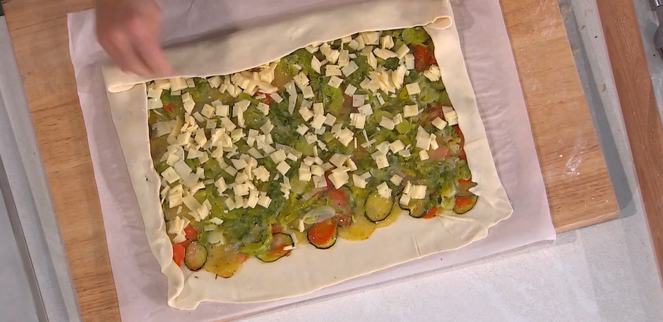 Stendiamo l’impasto con il mattarello, creando un rettangolo sottile. Distribuiamo sopra le verdure cotte in forno e, sopra queste, i porri stufati e il formaggio tilsiter a dadini. Arrotoliamo l’impasto, partendo dal lato lungo, sul ripieno, formando lo strudel. Lo posizioniamo su una teglia, spennelliamo con l’uovo sbattuto, spolveriamo con dei semi e cuociamo in forno caldo a 180° per 30 minuti, quindi a 170° per 20 minuti ancora.