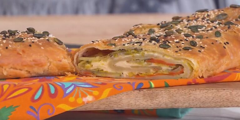 Stendiamo l’impasto con il mattarello, creando un rettangolo sottile. Distribuiamo sopra le verdure cotte in forno e, sopra queste, i porri stufati e il formaggio tilsiter a dadini. Arrotoliamo l’impasto, partendo dal lato lungo, sul ripieno, formando lo strudel. Lo posizioniamo su una teglia, spennelliamo con l’uovo sbattuto, spolveriamo con dei semi e cuociamo in forno caldo a 180° per 30 minuti, quindi a 170° per 20 minuti ancora.