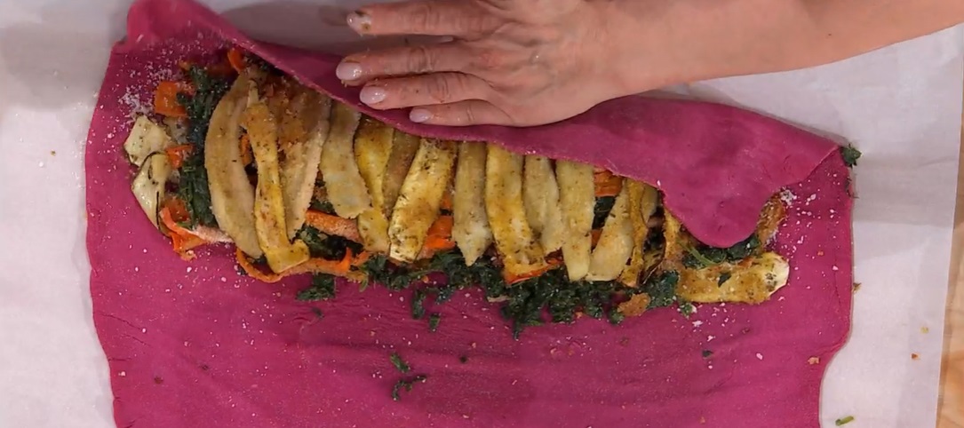 Per la pasta strudel, impastiamo la farina con la purea di barbabietola, l’acqua, un goccio di olio, lo yogurt e un pizzico di sale. Lasciamo riposare 30 minuti, poi tiriamo la pasta con il mattarello, ottenendo una sorta di sfoglia rettangolare.