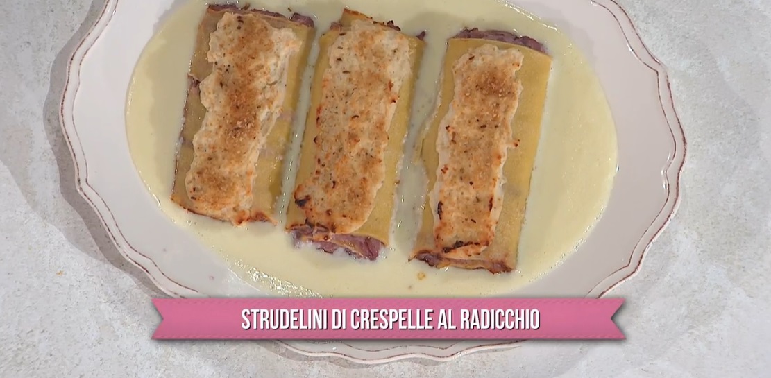 - Ripieno: 200 g radicchio, 60 g cipolla, 1 spicchio d’aglio, 40 g burro, 250 ml vino rosso, 200 g quark, 40 g formaggio grattugiato
