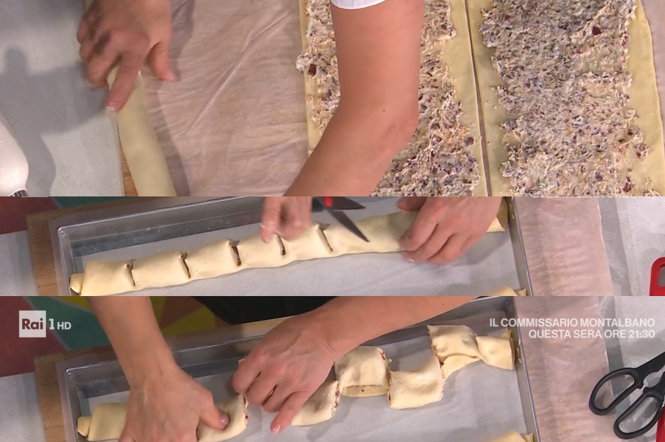 Stendiamo l’impasto, in modo da ottenere una sfoglia sottile e rettangolare. Dividiamo in tre rettangoli e dividiamo su ognuno il ripieno di cipolle e speck, che spalmiamo per bene. Arrotoliamo l’impasto sul ripieno, formando dei salsicciotti. Li disponiamo su una teglia e li incidiamo con una forbice, separando poi con le mani ogni sezione (foto).
