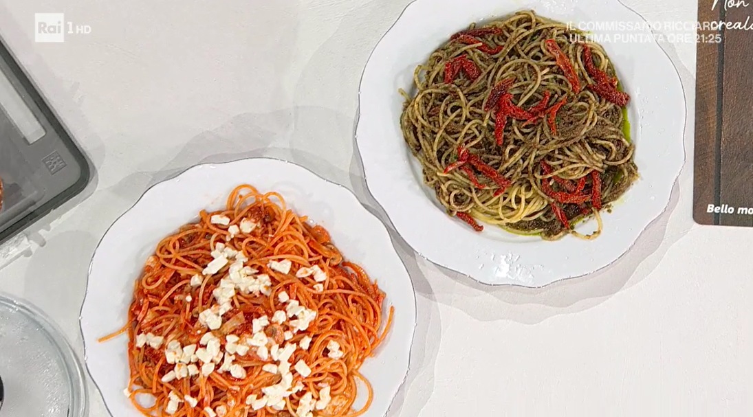 Per l’altro sugo, mettiamo nel mixer le olive denocciolate, un mazzetto di prezzemolo ed uno di basilico (solo le foglie), i cubetti di ghiaccio ed un generoso filo d’olio. Frulliamo fino ad ottenere una crema. Quando la pasta è cotta, la saltiamo pochi istanti con il pesto ed i pomodori secchi sott’olio tagliati a pezzetti.