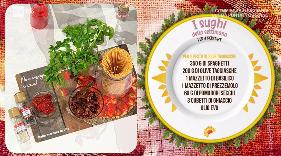 - 350 g spaghetti, 200 g olive taggiasche, 1 mazzetto di basilico, 1 mazzetto di prezzemolo, 60 g pomodori secchi, 3 cubetti di ghiaccio, olio evo